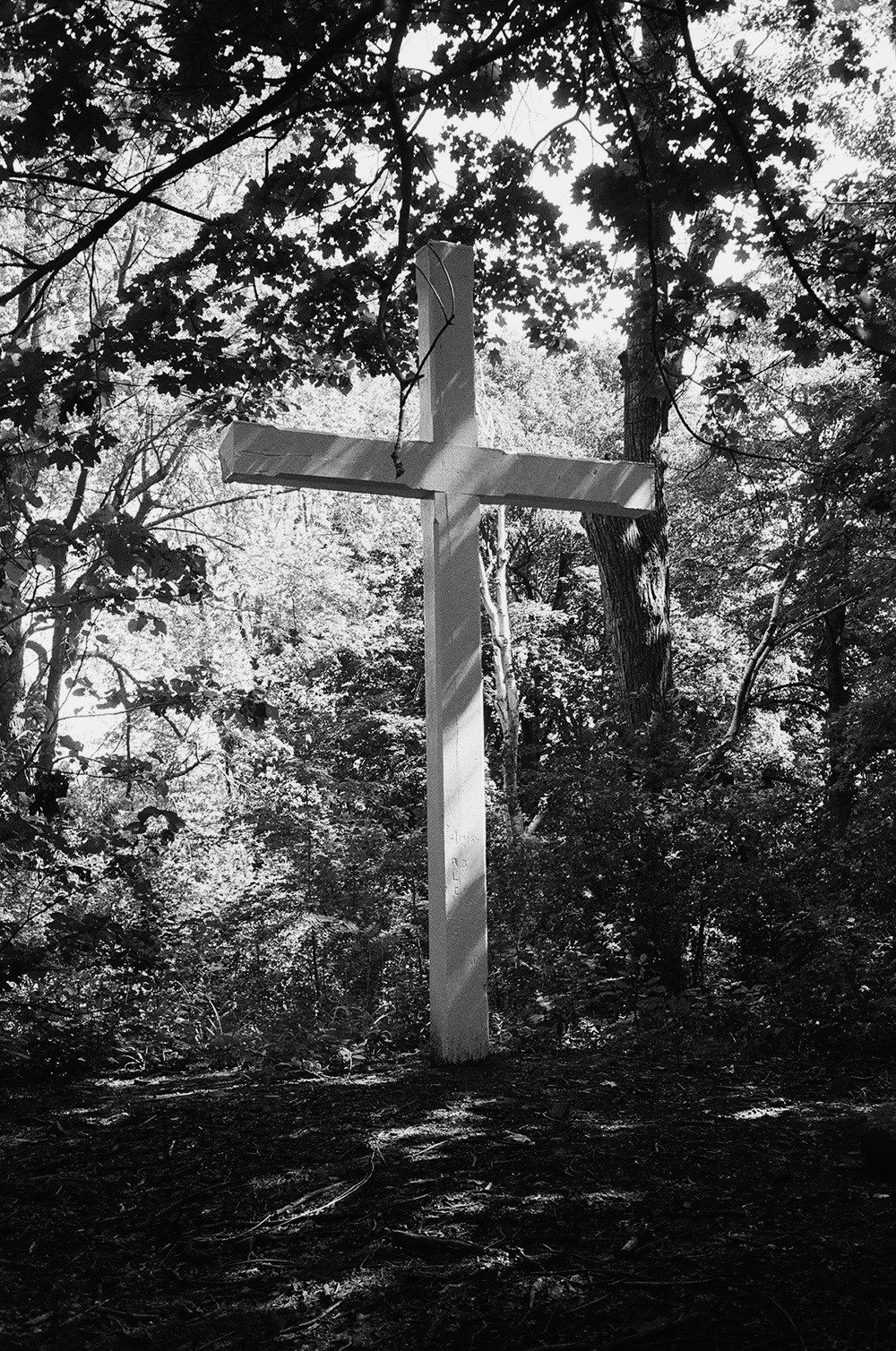 * Je suis récemment retourné à proximité de ces bois, avec le projet de photographier la Vierge. J’ai longé la clôture de fer forgé de bout en bout, sans en retrouver la trace. Seule une grande croix de bois blanc – que je n’avais pas remarquée à mon premier passage – était visible, plantée au fond d’une clairière. Le lendemain, je filais – zou ! – en bicyclette le long de la côte descendante qui longe le complexe M – les promoteurs immobiliers ont ainsi laïcisé le nom de l’ancien collège marial –, pour constater, du coin de l’œil, que la grille était ouverte. J’applique les freins. Je fais demi-tour. Coup d’œil aux alentours. Personne en vue. Je passe le portail et plonge dans la futaie. Je marche, avec ma bicyclette à mes côtés, à travers les herbes hautes. La lumière solaire strie mystérieusement le bois de la Croix blanche. La Vierge, apparue au plus fort de la période de confinement, n’est nulle part visible. Elle s’est évanouie du sous-bois. N’avait peut-être jamais été là. Vous n’avez pas d’autre choix que de me croire sur parole.